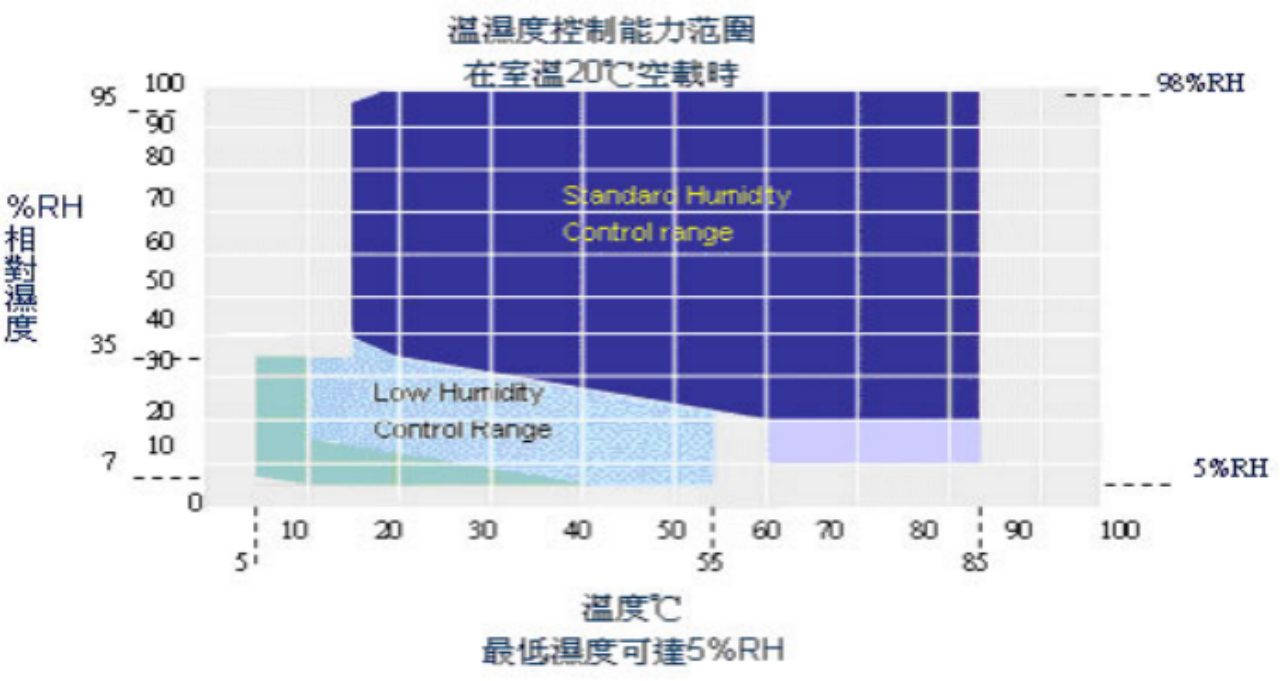 C.温湿度区域节能: a.湿度区域分为3部份区域,配以不同流量膨胀阀自动切换,匹配系统制冷及除湿能力, 减少加热加湿器耗电 b.如温湿度区域图红色部份最高温高湿区域停制冷系统,靠自然漏热恒定,有效节能。 | |